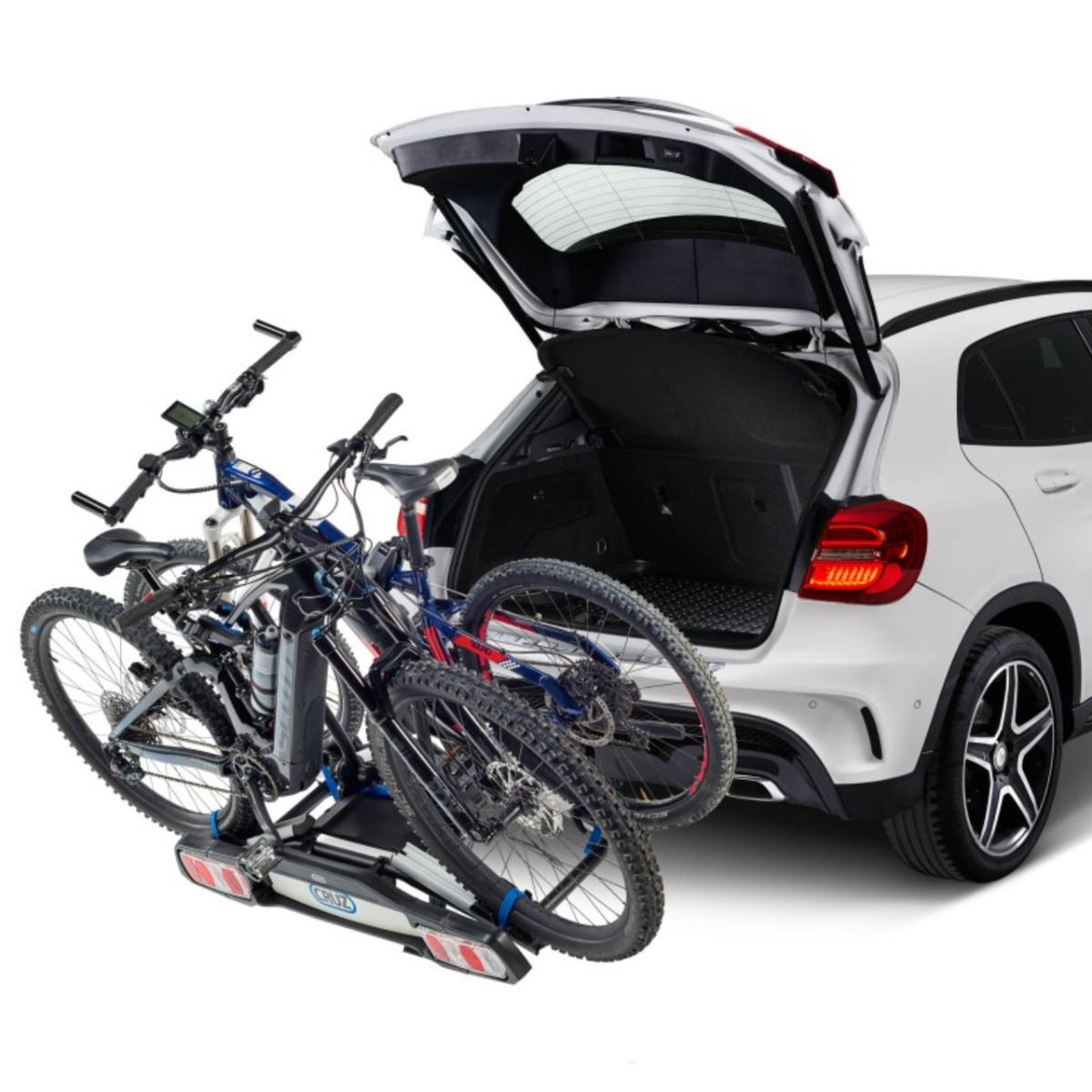 Functii | Sistem de fixare a rotilor cu eliberare rapida, Compatibil cu biciclete electrice, Rabatabil cu bicicletele montate, Priza electrica cu 13 pini, Sistem de prindere rapida cu maneta |